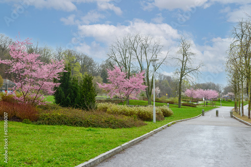 Fototapeta premium View of city park with blossoming trees