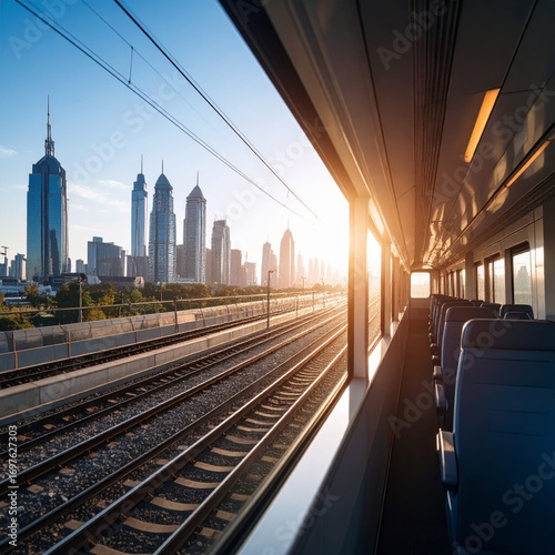 Naklejka premium View of city skyline through a window of a train, travel concept