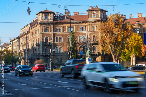 © soleg, Fototapeta premium View of city streets, architecture, houses and traffic, random people on the sidewalk, city life in Budapest, Hungary, Heroes Square