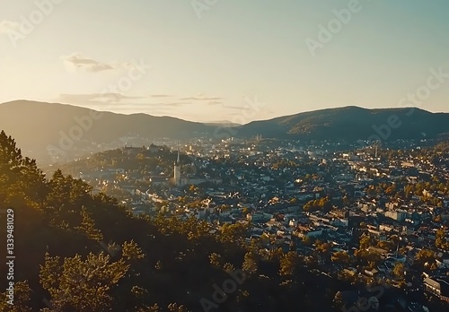 Naklejka premium View of cityscape in golden light from hillside; travel or tourism background