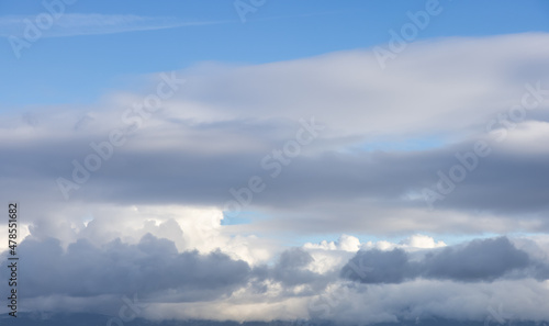 Naklejka premium View of Cloudscape during a cloudy blue sky sunny day. Taken over the mountain at the West Coast of British Columbia, Canada.