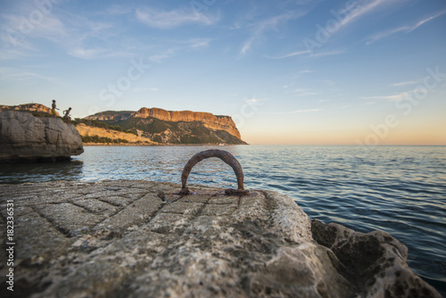 Fototapeta premium View of coastline in France with ancient ring for mooring boats in foreground