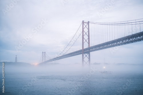 © Dmitry Rukhlenko, Fototapeta premium View of 25 de Abril Bridge famous tourist landmark of Lisbon connecting Lisboa and Almada in heavy fog mist wtih yacht boats passing under. Lisbon, Portugal