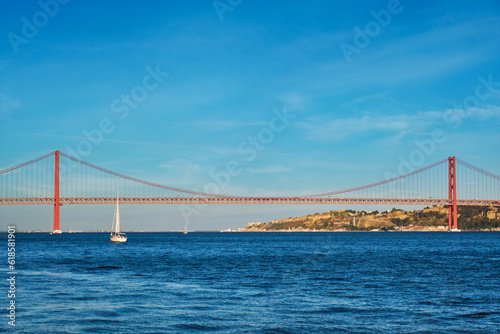 © Dmitry Rukhlenko, Fototapeta premium View of 25 de Abril Bridge famous tourist landmark over Tagus river and a tourist yacht boat at sunset. Lisbon, Portugal