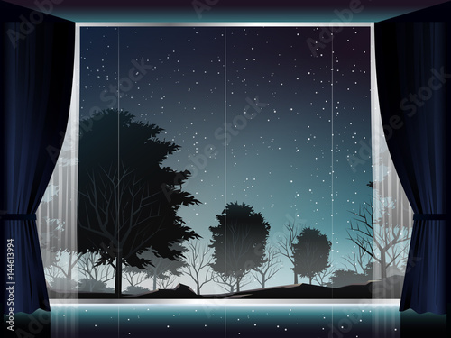 © moga52, Fototapeta premium view of deep forest at night in room with large window