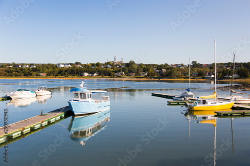 © Anne Richard, Obraz premium View of docked boats in small Trois-Pistoles marina, with 19th Century Notre-Dame-des-Neiges Church and other buildings in the background during a late summer afternoon, Quebec, Canada