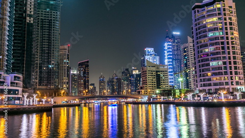 Naklejka premium View of Dubai Marina Towers and canal in Dubai night timelapse