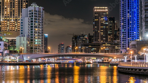 Naklejka premium View of Dubai Marina Towers and canal in Dubai night timelapse