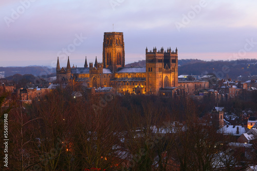 Fototapeta premium View of Durham City just after sunset, with the Cathedral floodlit. County...