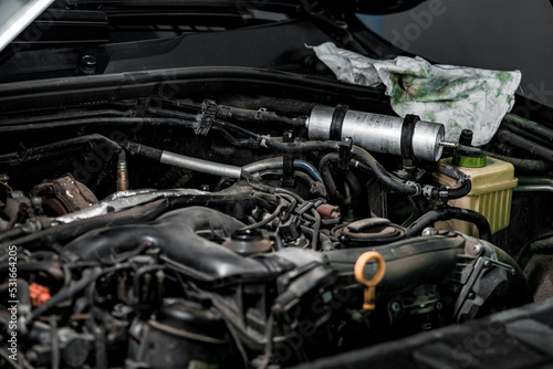 Fototapeta premium View of engine and other parts under the open hood of a car