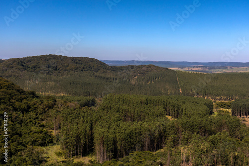 © Andrea Cirillo Lopes, Fototapeta premium view of eucalyptus plantation, with vegetation and mountains in the background.