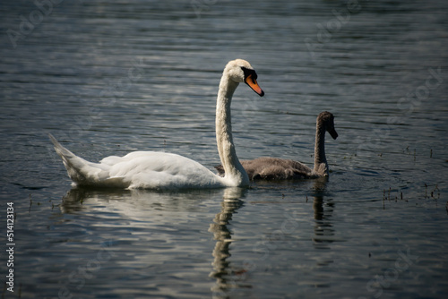Fototapeta premium View of family swan with mother and babies swimming in the water