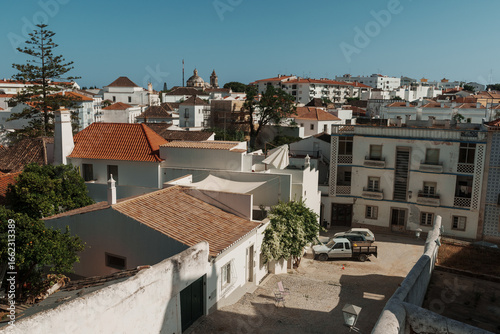 Obraz premium View of Faro old town with tiled roofs and dome of Igreja do Carmo, Algarve,...