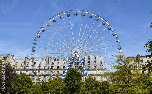 Fototapeta premium View of Ferris wheel, trees and buildings at Jardin Des Tuileries in Paris.