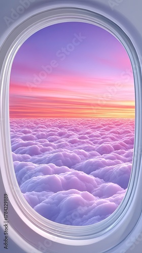 Obraz premium View Of Fluffy White Clouds Below An Airplane Window During A Vibrant Pink...