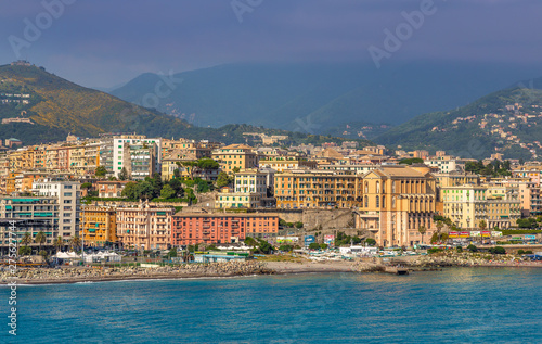Fototapeta premium View of Genoa (Genova) from the port when arriving by ship, at sunrise with...