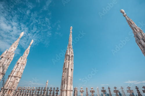 Fototapeta premium view of Gothic architecture and art on the roof of Milan Cathedral (Duomo di Milano), Italy