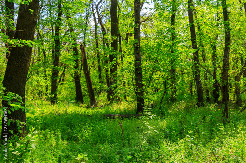 © olyasolodenko, Fototapeta premium View of green forest at spring
