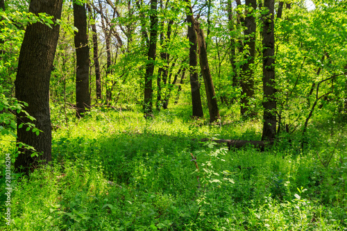 © olyasolodenko, Fototapeta premium View of green forest at spring