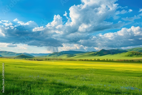 © Ruslan, Fototapeta premium View of green meadows and hills in the spring countryside