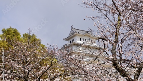 Fototapeta premium View of Himeji castle from behind cherry blossom blooms