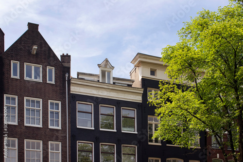 Fototapeta premium View of historical, traditional and typical buildings showing Dutch architectural style and a tree in Amsterdam. It is a sunny summer day.