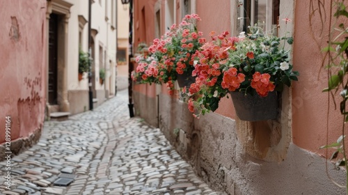 Fototapeta premium view of house walls decorated with flowers and roads