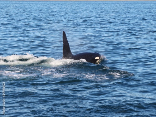 © Андрей Рыков, Obraz premium View of killer whale above water near Kamchatka Peninsula, Russia. The killer whale or orca (Orcinus orca) is a toothed whale belonging to the oceanic dolphin family, of which it is the largest member