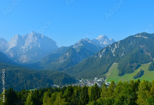 Fototapeta premium View of Kranjska Gora town bellow the mountains in Gorenjska, Slovenia