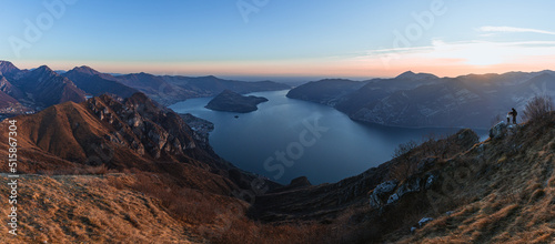 © Roberto, Obraz premium View of Lake Iseo at sunset, with the alps framing it, near the town of Zone, Italy - February 2022.
