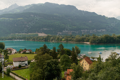 © Viktoriia, Fototapeta premium View of Lake Walen, Switzerland, Swiss Alps, Canton St. Gallen, Chatzenberg, summer 2025. Trees, meadows and small villages in the valley. mountains, beautiful landscape hiking, recreation.