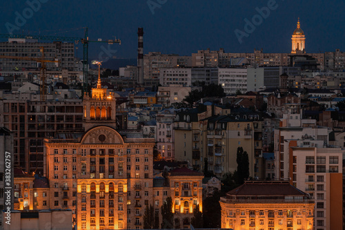 © liquidnitrogen, Naklejka premium View of Lipki, Kiev. Stalin's house with a star, the bell tower of the Kiev Pechersk Lavra, workshops of the Arsenal plant. Aerial shot