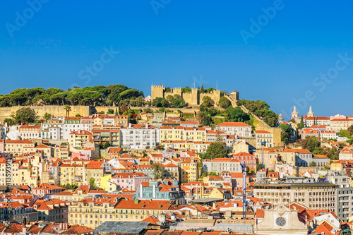 © Kushch Dmitry, Fototapeta premium View of Lisbon from the observation point. A view to the houses roofs from a bird's-eye view. Lisabon. Portugal