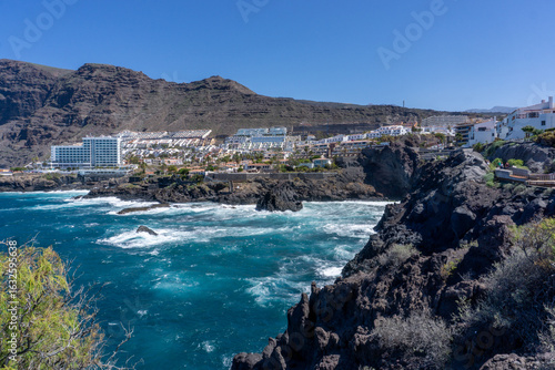 © pilar, Obraz premium View of Los Gigantes Tourist City in Tenerife, Canary Islands, Surrounded by Ocean, Rocky Cliffs, and Vacation Architecture under the Bright Summer Sky