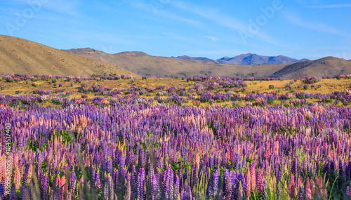 © Victorflowerfly, Fototapeta premium View of Lupin Flower Field near Lake Tekapo Landscape, New Zealand. Various, Colorful Lupin Flowers in full bloom with the background of mountain ranges.