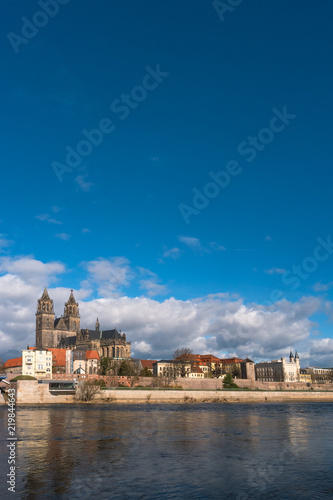Obraz premium View of Magdeburg Cathedral and Elbe river from another side, Magdeburg, Germany