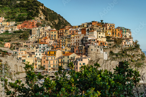 © Eva, Fototapeta premium View of Manarola,Cinque Terre,Italy.UNESCO Heritage Site.Picturesque colorful village on rock above sea.Summer holiday,travel background.Italian Riviera landscape.Houses on steep cliff,vineyards