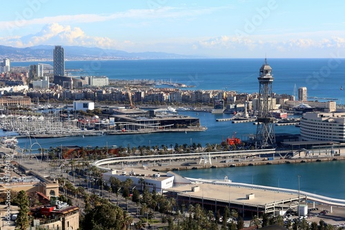 Fototapeta premium View of Maremagnum Shopping Center building and Aerial Tramway Torre Jaume of...