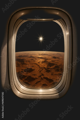 Obraz premium View of Mars from spaceship window, outer space scene, airplane window, futuristic travel