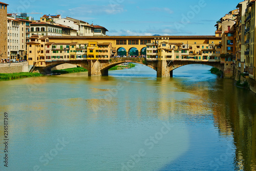 Obraz premium View of medieval stone bridge Ponte Vecchio and the Arno River in Florence, Tuscany, Italy. Florence is a popular tourist destination of Europe.