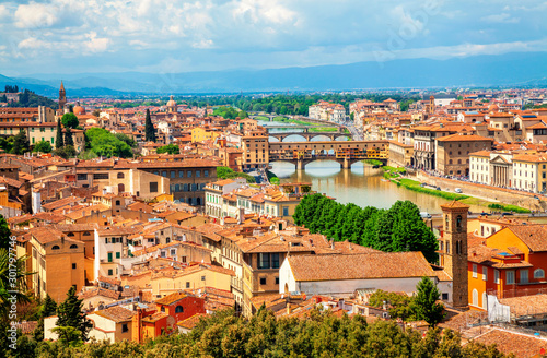 © Vladimir Sazonov, Fototapeta premium View of medieval stone bridge Ponte Vecchio over Arno river in Florence, Tuscany, Italy. Florence cityscape. Florence architecture and landmark.