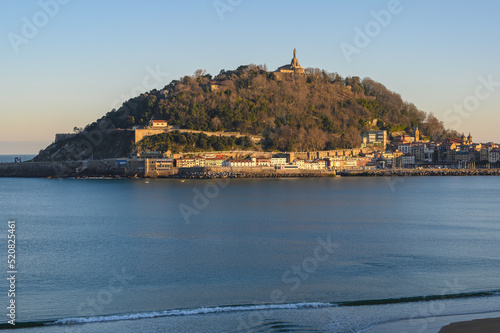 Naklejka premium view of monte urgull, the old port of San Sebastián, the old city, at sunrise...
