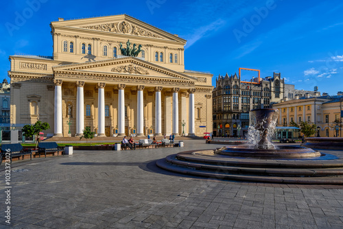 Fototapeta premium View of Moscow Bolshoi Theatre (Big Theatre) and Fountain in Moscow, Russia. Moscow architecture and landmark, Moscow cityscape
