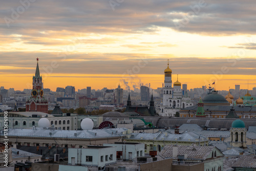 © Андрей Рыков, Naklejka premium View of Moscow's skyline at sunset with historical buildings and rooftops