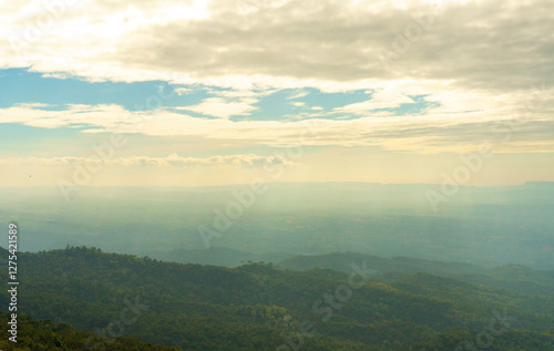 Naklejka premium View of Mountain Tops on a Warm Summer Day – Clouds in the Sky Over the Way to Phu Hin Rong Kla and Phu Lom Lo. Scenic Landscape of Phitsanulok, Thailand. Nature, Travel, and Adventure Destination.