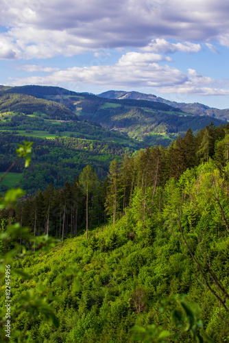 Obraz premium View of mountains covered with green forests against a cloudy sky