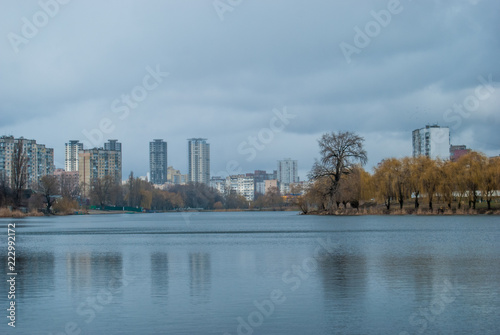 © Konstiantyn Zap, Fototapeta premium View of multi-storey houses from the lake