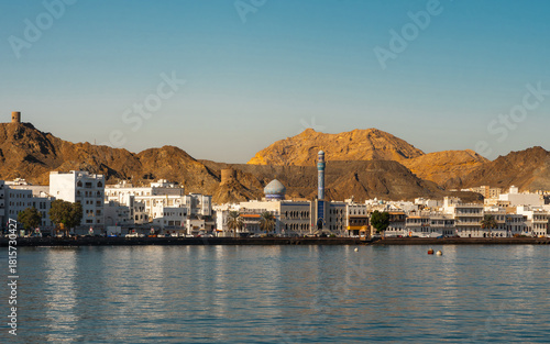 © a_medvedkov, Fototapeta premium View of Mutrah Corniche with coastal road, buildings and rocky hills