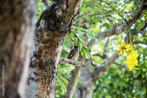 Obraz premium View of Mynas or Acridotheres bird perched on a branch, focus selective