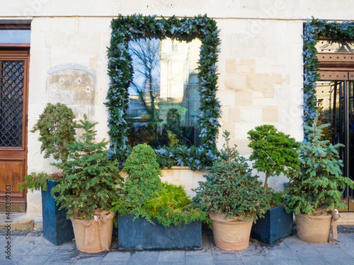 Naklejka premium View of New Year or Christmas decoration with a lot of fir trees with lights during winter holidays in Lviv city, Ukraine. Christmas installation on the street